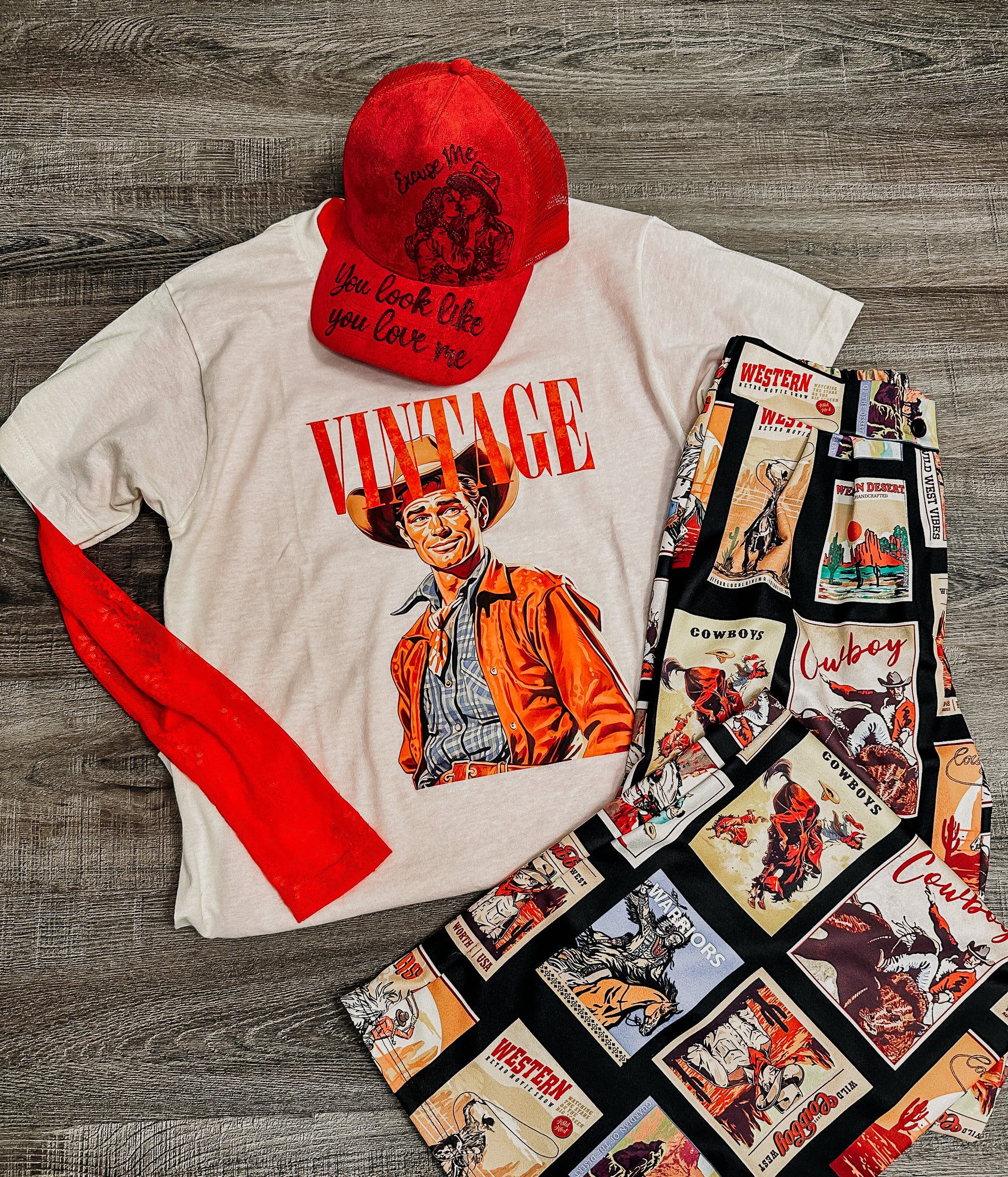 Saddle up and turn heads with The Stampede Slack Pants—a bold western statement that brings retro flair to your everyday look. Featuring a unique cowboy stamps print, these pants combine classic western charm with a wide-leg cut for added style. The front button and zip closure, along with a back elastic waistband, offer comfort and flexibility, making them perfect for long days at the rodeo or casual outings.