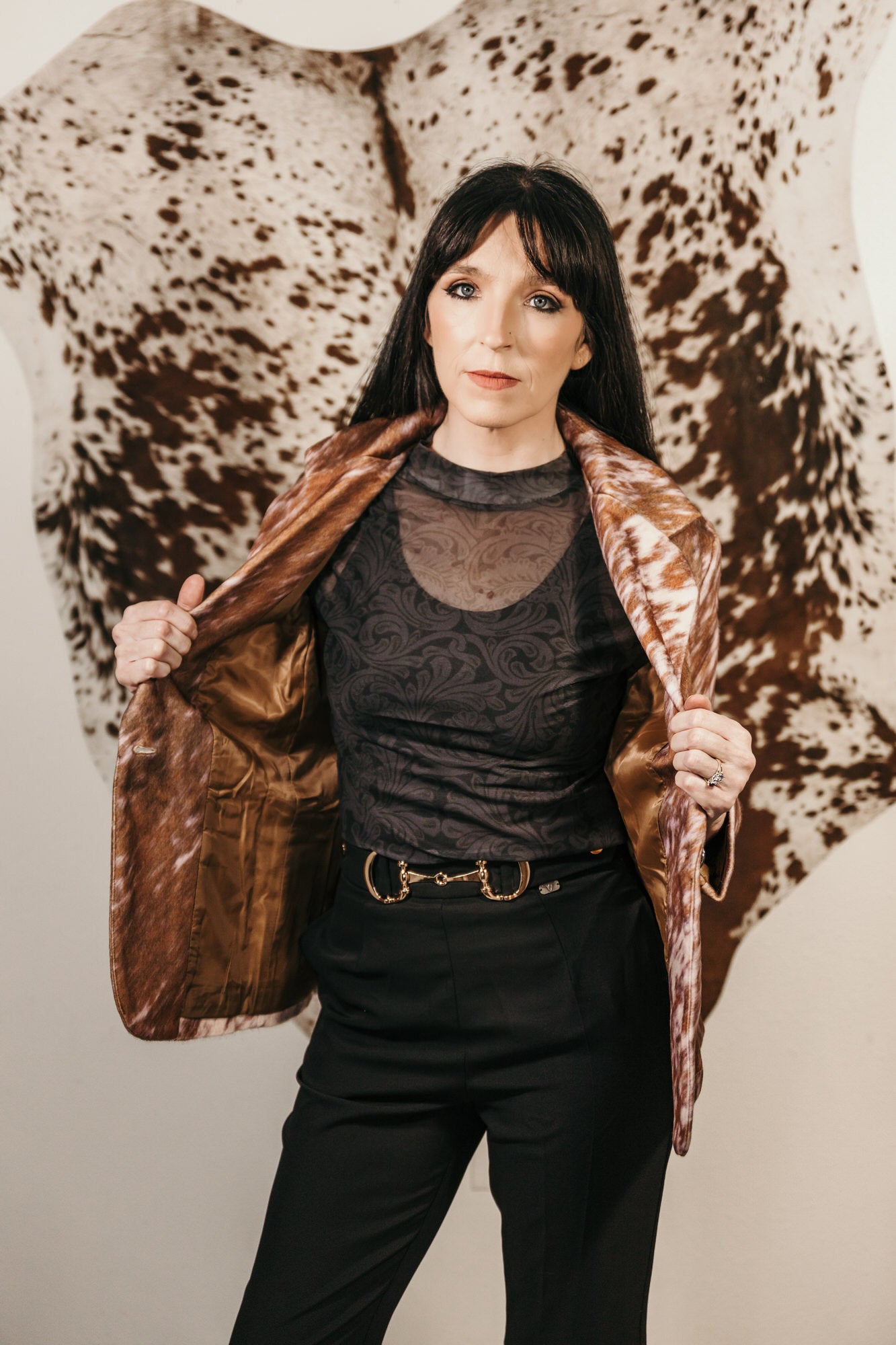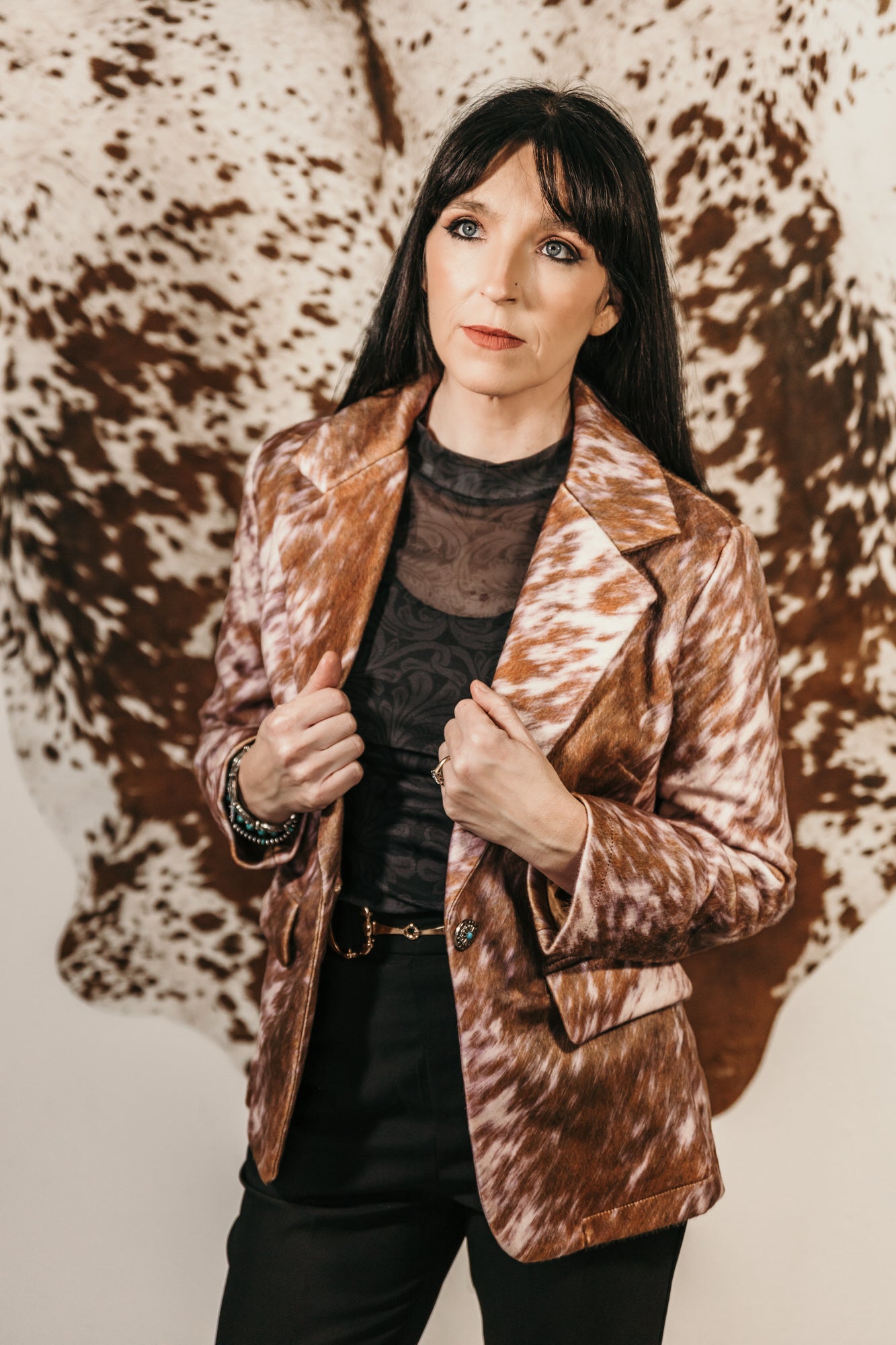 Make an entrance they won’t forget in the When the Cows Come Home Blazer — where classic tailoring meets wild Western charm. This head-turning statement piece features a faux cowhide print with a subtle pink hue that adds a modern twist to traditional cowgirl style. The fabric feels like soft hair, giving it that luxe touch without the weight or bulk of real hide.