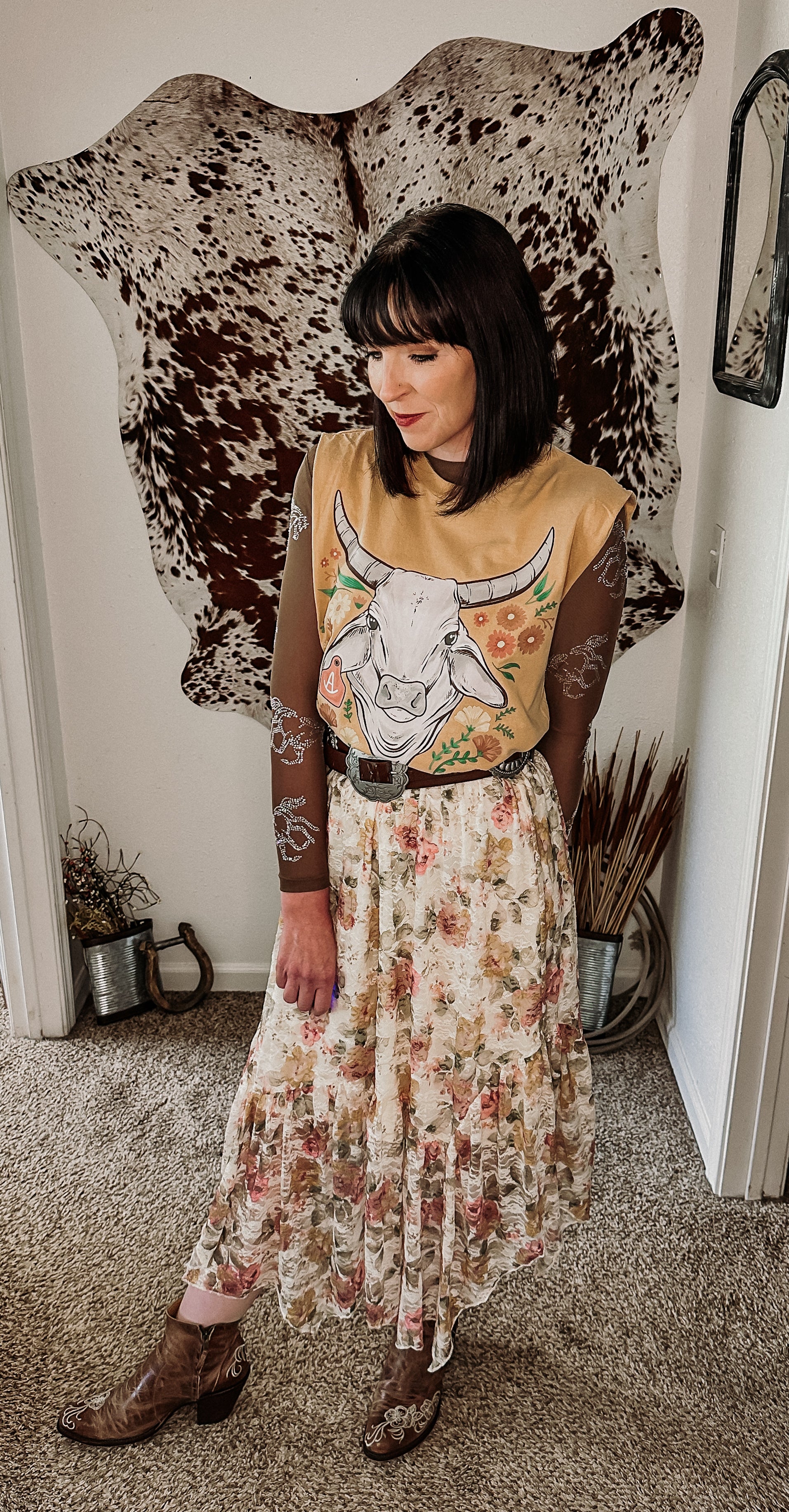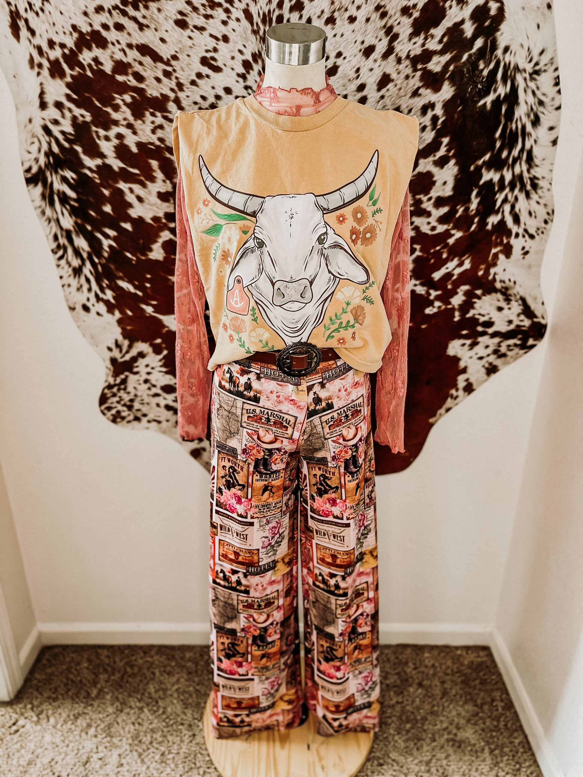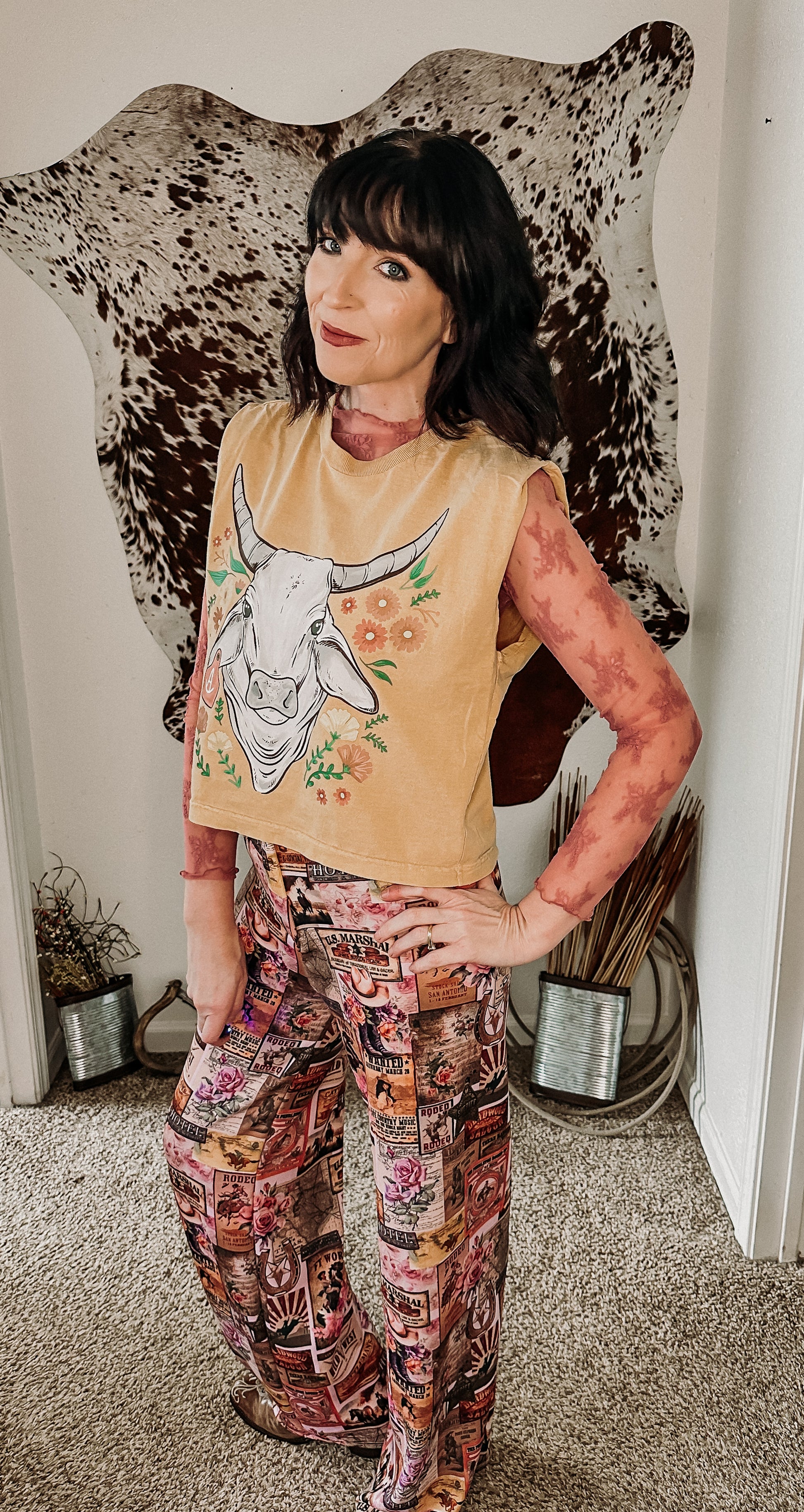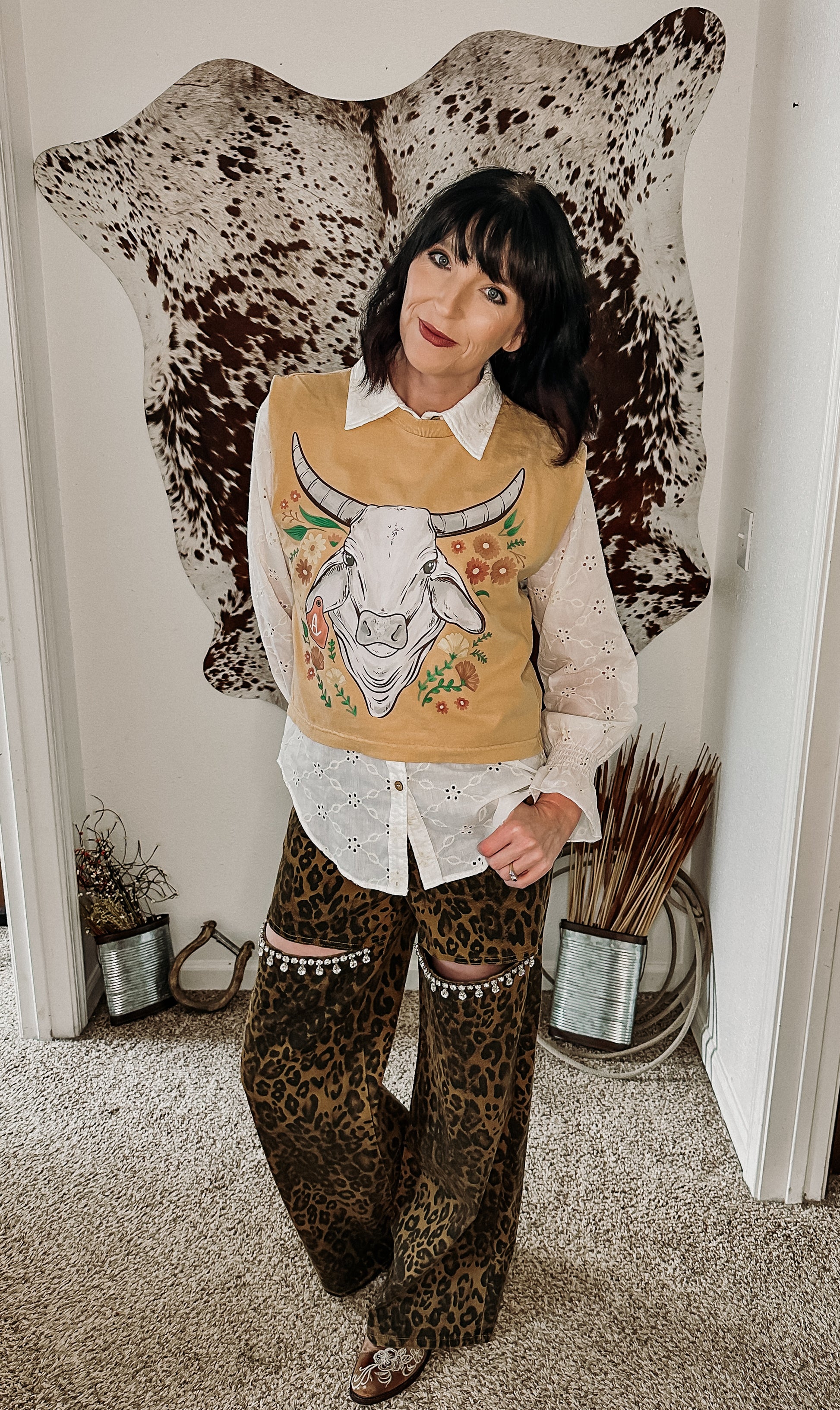 Bold like a Brahma, soft like a bloom. The Wild Bloom Brahma Tee is an exclusive cropped muscle tee featuring a mustard base and a one-of-a-kind floral bull graphic. Designed for cowgirls who live loud, love harder, and aren’t afraid to stand out, this sleeveless tee is the perfect mix of edge and charm.