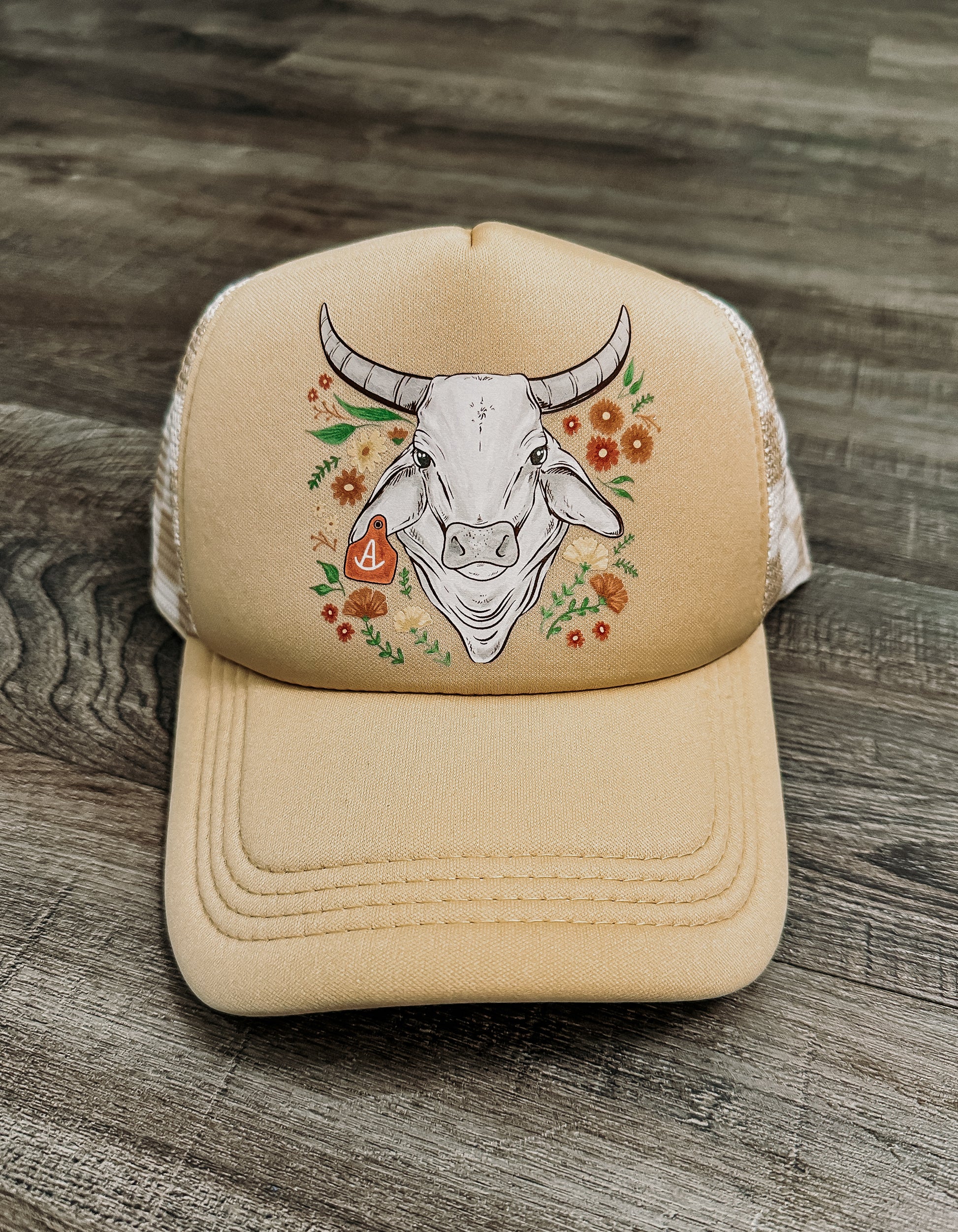 This Wild Bloom trucker hat is a Western Junkie Co exclusive, featuring our signature floral Brahma design on a soft tan/muted mustard front. The checkered mesh back adds a touch of boho grit while the bright floral bull brings full-on cowgirl bloom energy.