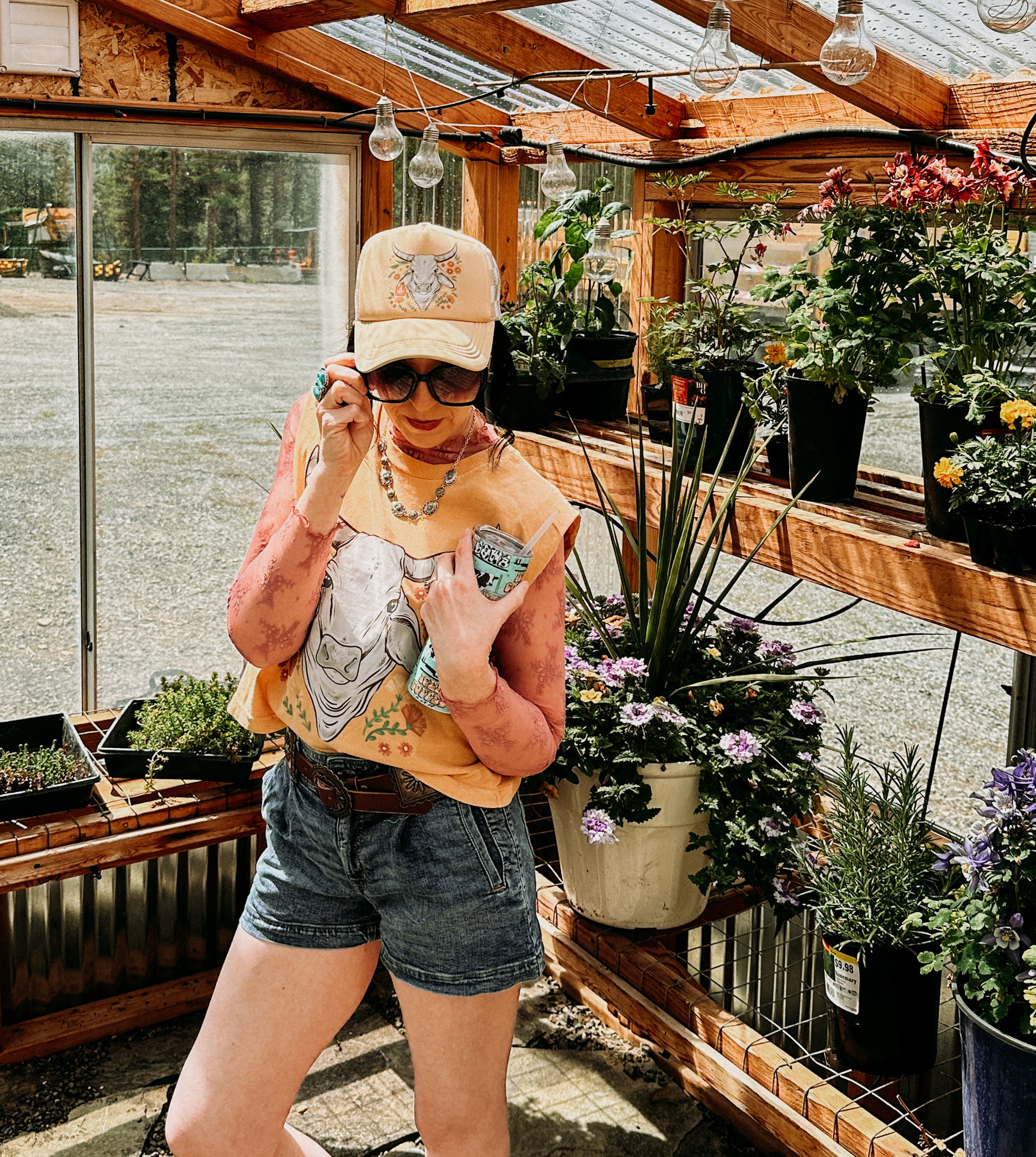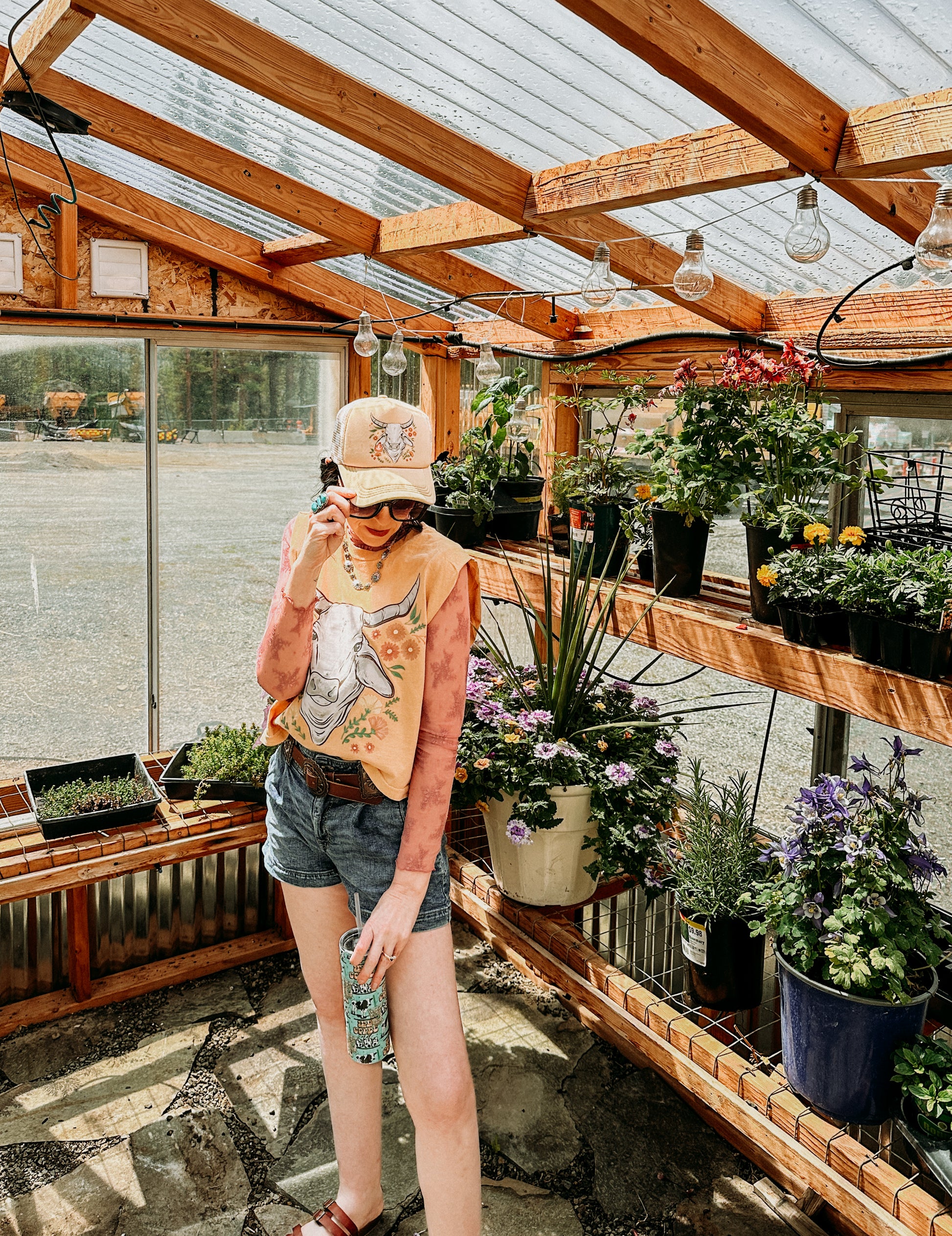 Inspired by greenhouse mornings, iced coffee sips, and a slow head shake that says “I’m not dealing with your nonsense today.” Styled in our greenhouse shoot with iced coffee in hand and attitude in the air—this hat is pure main character energy.