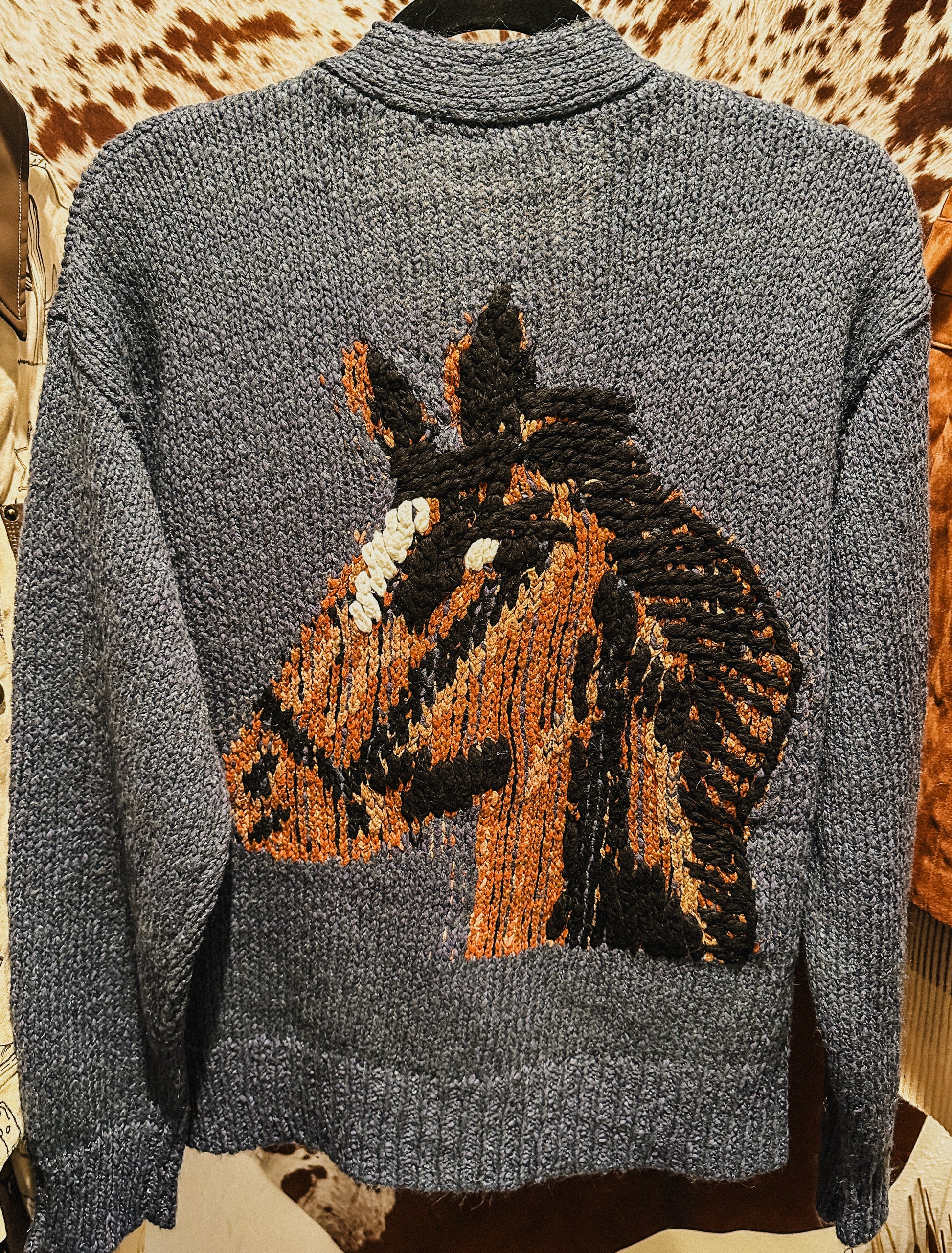 Make a bold western statement in the Wild Mustang Cardigan. This soft knit button-front sweater pairs cozy comfort with cowgirl energy, featuring relaxed dropped shoulders, ribbed hems, and playful horseshoe detailing on the front patch pockets. The real showstopper? A bold horse graphic splashed across the back that takes this cardigan from everyday cozy to rodeo-ready. Perfect for layering over tees, dresses, or denim when you want a touch of western drama without losing comfort.